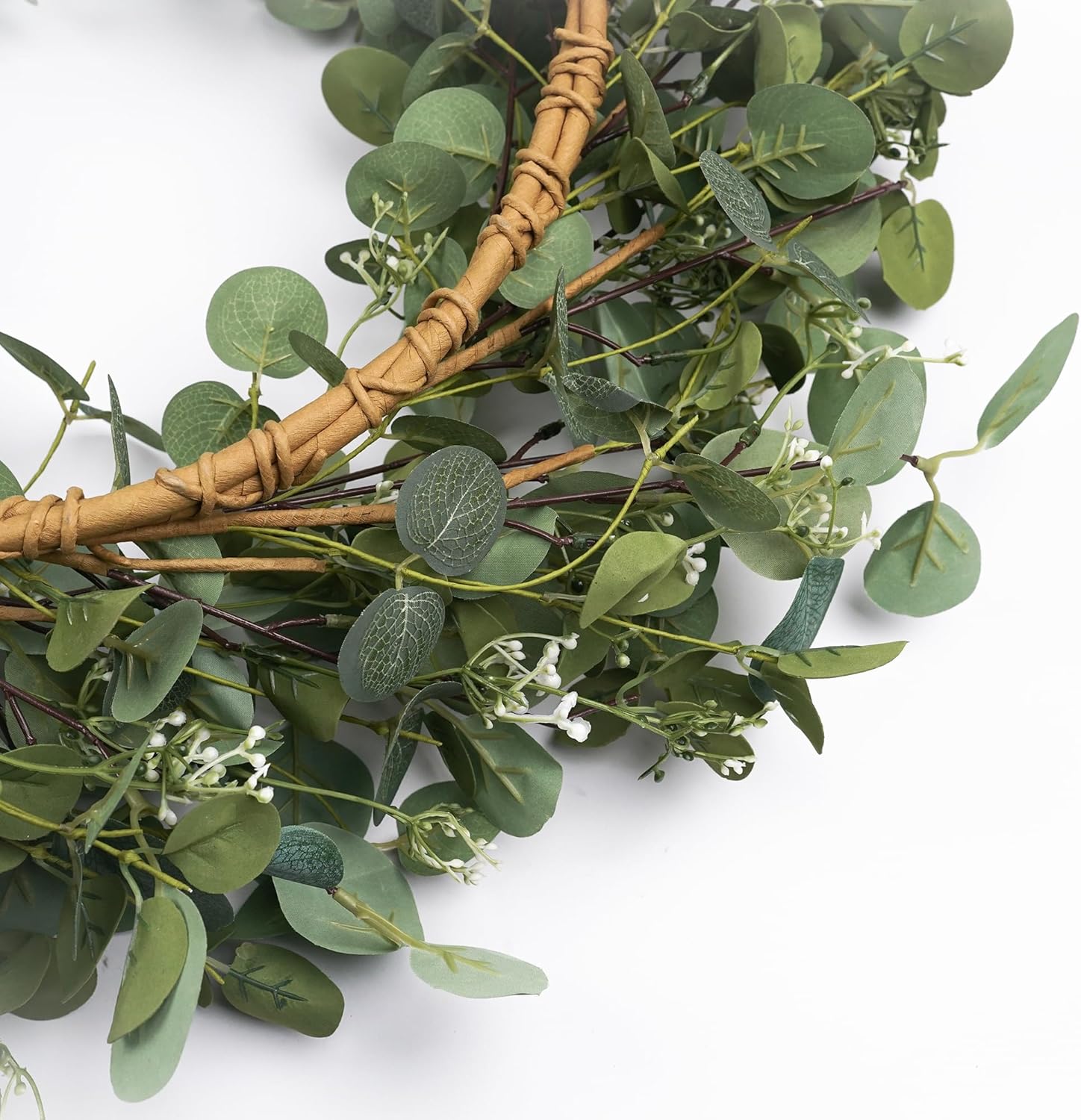 Homekaren Artificial Eucalyptus Wreaths for All SeasonThis beautiful artificial eucalyptus wreath can be as mothers day gifts, Valentines Day Wreath, Easter Wreath,and Fall Wreath and Winter Wreath as your expectations.The wreath can be used indoors or outdoors,it can hang on window and wall too. The beautiful wreath will bring an enjoyable ambiance all year round.Features:22 Inch Real Size Floral WreathJust easily adjust the stems, this green wreath will display as a 22 inches large green wreath, absolutely large enough as a front door wreath.Silk Flowers and LeavesThe flower wreath is made from artificial silk eucalyptus leaves and flowers that cover fully on the wreath base, mixed with mini leaves.High Quaity and Great PackageThe wreath will never wither and you can clean them with water in any time you want. This is not recommended to put it outside on your front door with direct sunlight. The wreath will arrive to your doorstep packed in a storage box to protect the wreath and store for seasons to come.NOTE:Due to the difference of shooting angle, light and display, the wreath you received may have slight color difference with the picture.If you have any questions,please feel free to contact us, we will reply in time.