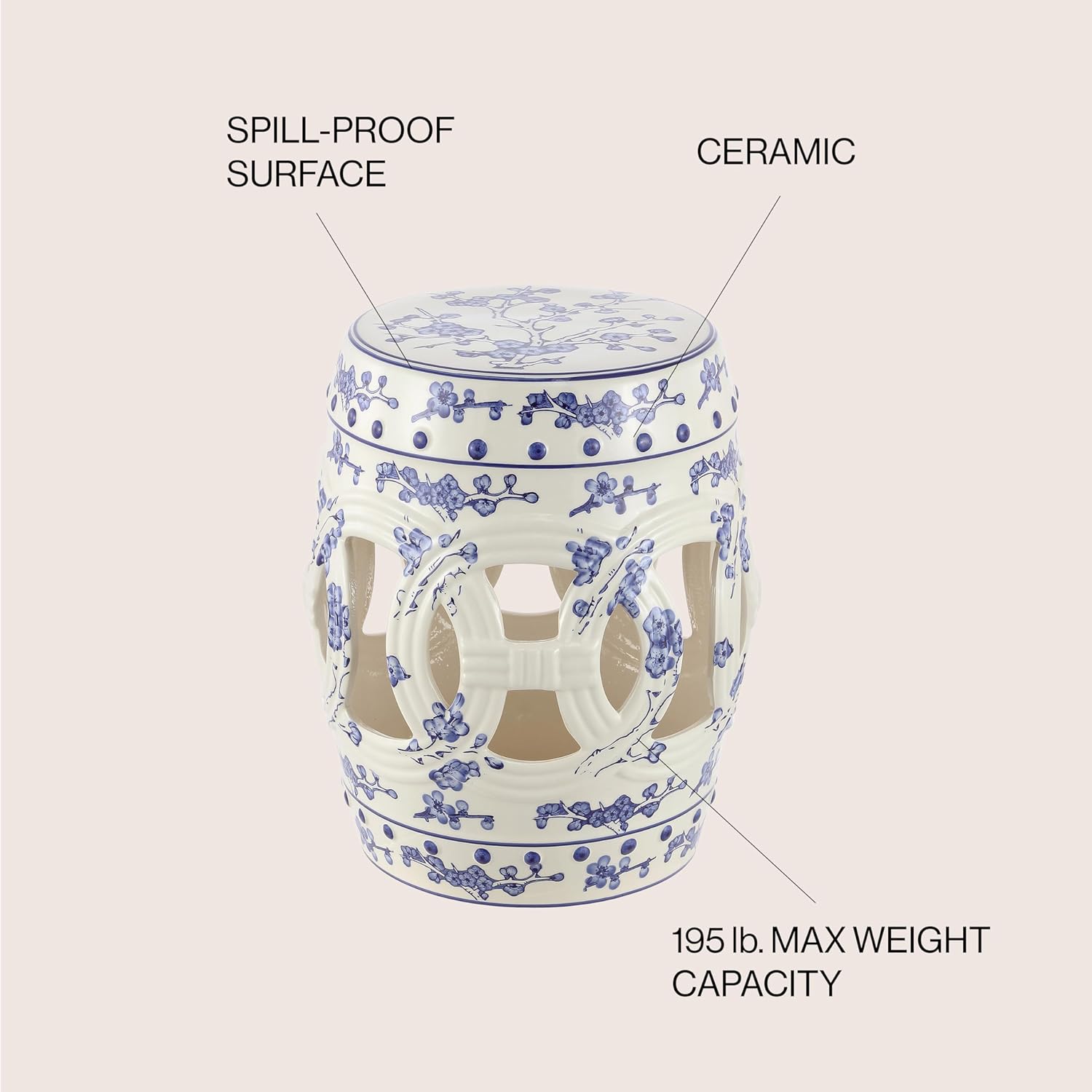 Our drum-shaped ceramic Chinese garden stool brings good fortune with a central band of lucky coin symbols. Chinoiserie garden seats are loved by traditional design fans, but our blue and white glaze gives this stool a modern touch. Use it indoors or outside as a cocktail table, garden seat, or plant stand.